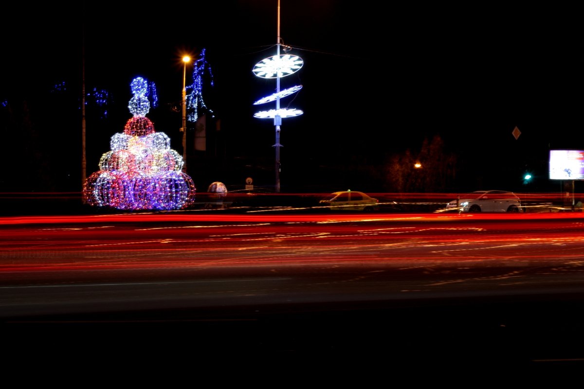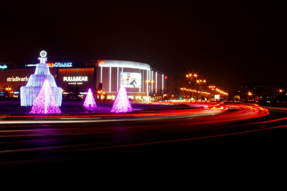 Eu am incercat sa le fac poze din rondul din Romana. Mi-am fixat frumusel trepiedul, am reglat aparatul si m-am pus pe treaba. Efortul meu a durat 5 minute dupa care am fost oprit de un politist care s-a prins imediat ca am traversat strada ilegal pentru a ajunge acolo. Nu am reusit sa-l induplec sa ma mai lase sa stau, asa ca va prezint ce am reusit sa fac pe fuga. Se vede treaba ca nicio lumina de Craciun n-a putut sa-i lumineze mintea acelui politist.