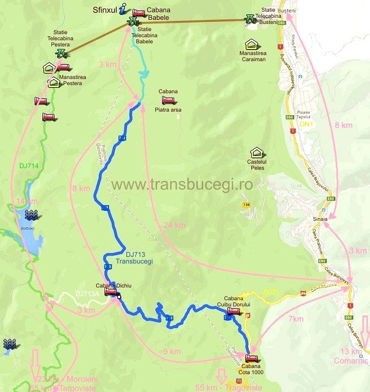 Veti folosi drumul Transbucegi. Sigur ati auzit de el pentru ca in ultima vreme a fost tare mediatizat. Noroc ca a iesit la iveala Transbucegiul pentru ca o serie intreaga de comentatori galagiosi sa-si gaseasca o noua preocupare: salvarea Bucegilor de la invazia turistilor. Vezi doamne, pana acum Bucegii erau un fel de taram virgin, un fel padure neatinsa si acum cu drumul asta pot ajunge toti grataragii in slapi la Babele. Trecem peste aceste penibilitati si ne vedem linistiti de drum, care apropo este senzational. Este unul dintre putinele drumuri pe care le are Romania pe care iti vine sa tot mergi, nu sa fugi prin alte parti. Transbucegiul are o lungime de 20 km, 17 din ei fiind asfaltati. Drmul se desprinde din DN71, care face legatura intre Sinaia si Targoviste, cu putin inainte ca acesta sa ajunga la Cabana Cota 1000. Drumul trece pe langa Cabana Cuibul Dorului, urca Saua Dichiu unde in dreptul Cabanei Dichiu coteste brusc la dreapta si strabatate Platoul Bucegi pana in apropierea Cabanei Piatra Arsa, dupa cum arata site-ul de prezentare al proiectului.