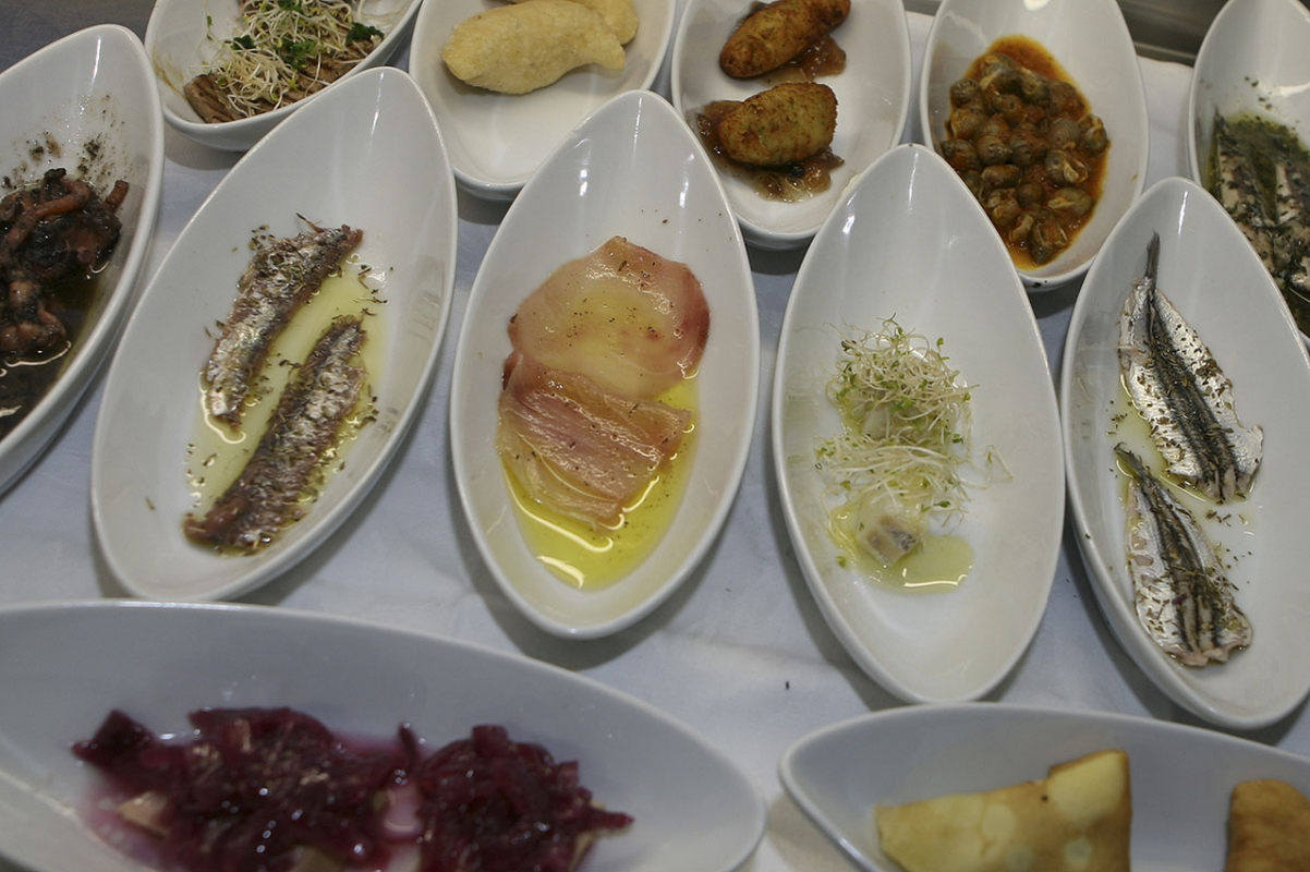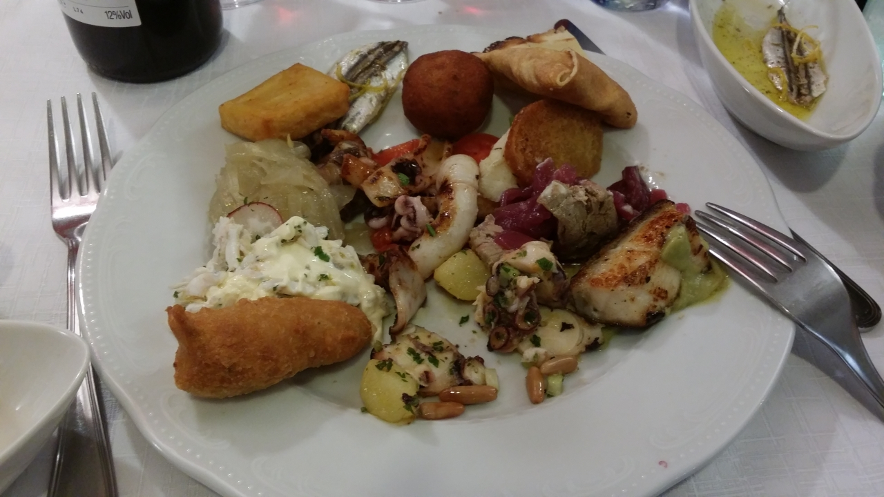 Am ajuns acolo infrigurati, dar in crasma era o lumina calda si o muzica plapanda care ne-au incalzit pe loc. A venit un chelner vioi si intr-o italiana vesela ne-a facut cateva recomandari. Am luat un antreu de-al casei.  Mi-ar placea sa va zic ce continea fiecare minune care ne-a fost adusa, dar nu mai tin minte. Stiu doar ca erau 12 farfurii mici si pe fiecare din dansele era cate o specialitate din mare. Pe una erau doi pestisori micuti scaldati in suc auriu de lamaie, pe alta erau niste gogosele cu mozzarella, dincolo erau doua bucati de ton cu ceapa rosie, mai departe se odihneau niste chiftelute din peste si tot asa. Iti venea sa le mananci cu ochii de frumoase ce erau, dar mai bune erau cand aromele ti se zdrobeau in gura.