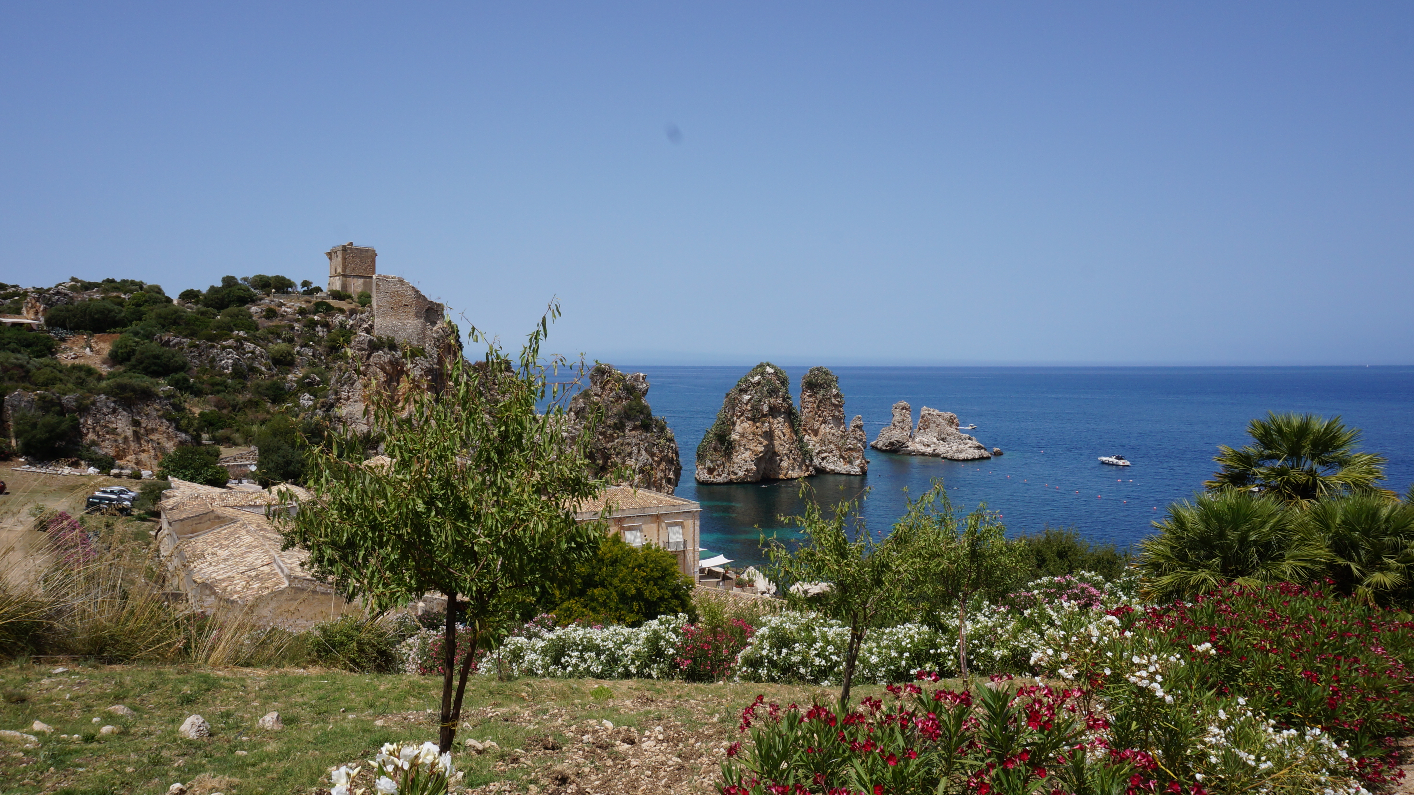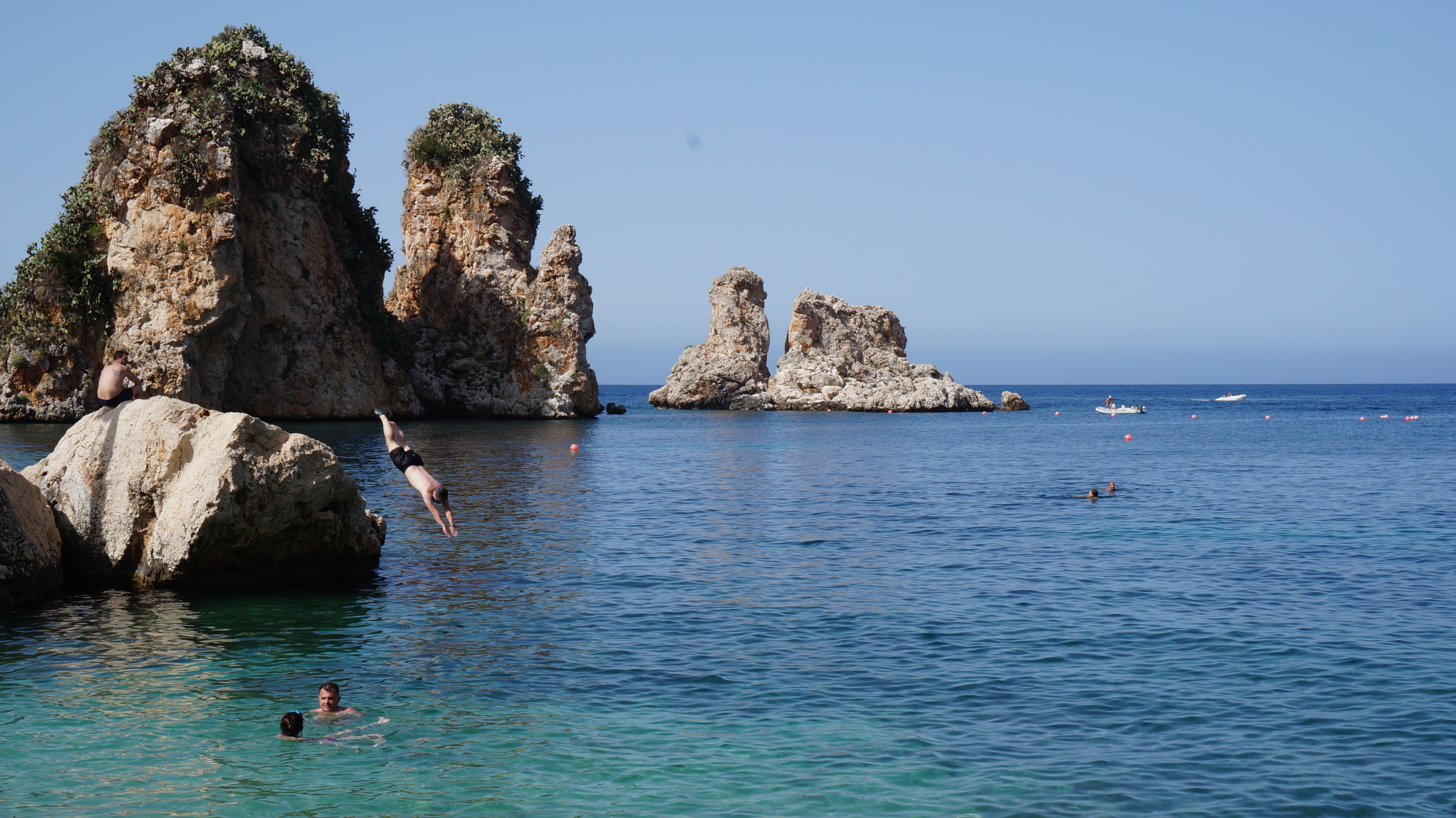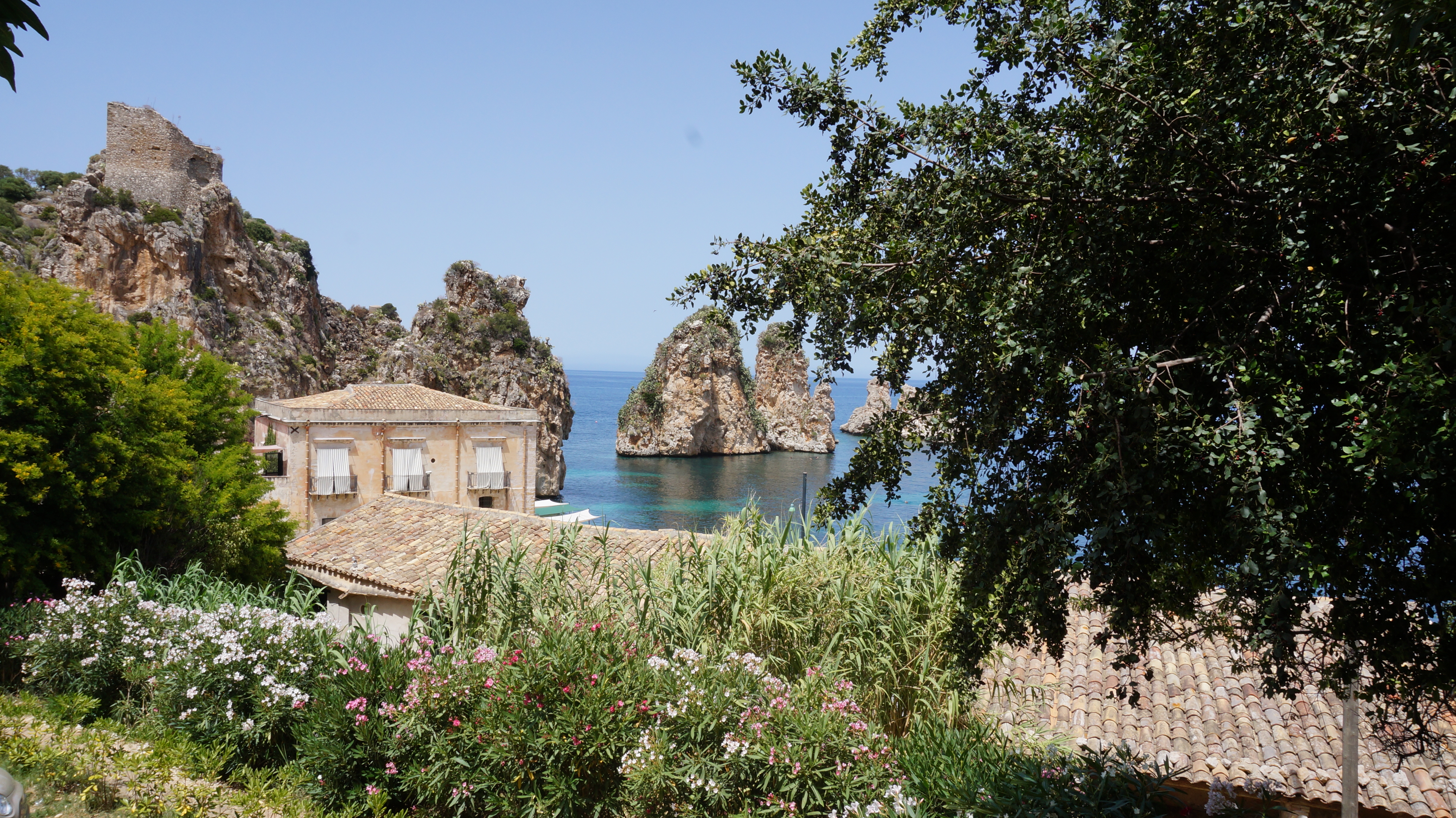 Am plecat a doua zi sa vedem rezervatia naturala Zingaro. Mda, si nu prea am plecat in zorii zilei ca sa putem face pe racoare cei 7 kilometri care te duc la niste plaje foarte frumoase, ci am plecat la 10 dimineata, fara apa si fara sa avem habar ca trebuie sa mergem 7 kilometri pana la plaje. Prostia sa plateste. Cred ca sunt niste plaje frumoase, dar noi am mers vreo doua ore printr-o caldura usturatoare, ne-am bronzat in dulcele stil tranctorist din prima zi si nu am facut nicio baie pentru ca drumul, atat cat am facut noi din el, nu cobora spre mare. Pedeapsa era si mai grea pentru ca puteai vedea apa langa tine, apa albastra si curata, racoroasa, apa care te chema la ea, dar tu ca prostul stateai sa te bata soarele pentru ca nu aveau cum sa cobori. Cum ziceam, prostia se plateste. Dupa ce ne-am mai revenit putin (si din prostie, sper), am oprit la Scopello sa facem totusi o baie. Acest loc este format din cateva case superbe, aflate in buza apei, in fata unei dintre ele fiind asezate trei randuri de sezlonguri. Apa de aici era un vis. Sincera sa fiu, putea sa fie o baltoaca obosita si tot ma aruncam in ea. Cand am intrat in apa am ajuns in rai si am stat acolo vreo 40 de minute. A fost perfect. In plus, am vazut si o caracatita pentru prima data in viata mea. Mi-a fost un picut frica, dar tot am stat 10 minute sa o spionez pana a decis sa se bage sub o piatra. Am stat la Scopello ore bune pentru ca rezervatia naturala Zingaro ne terminase.