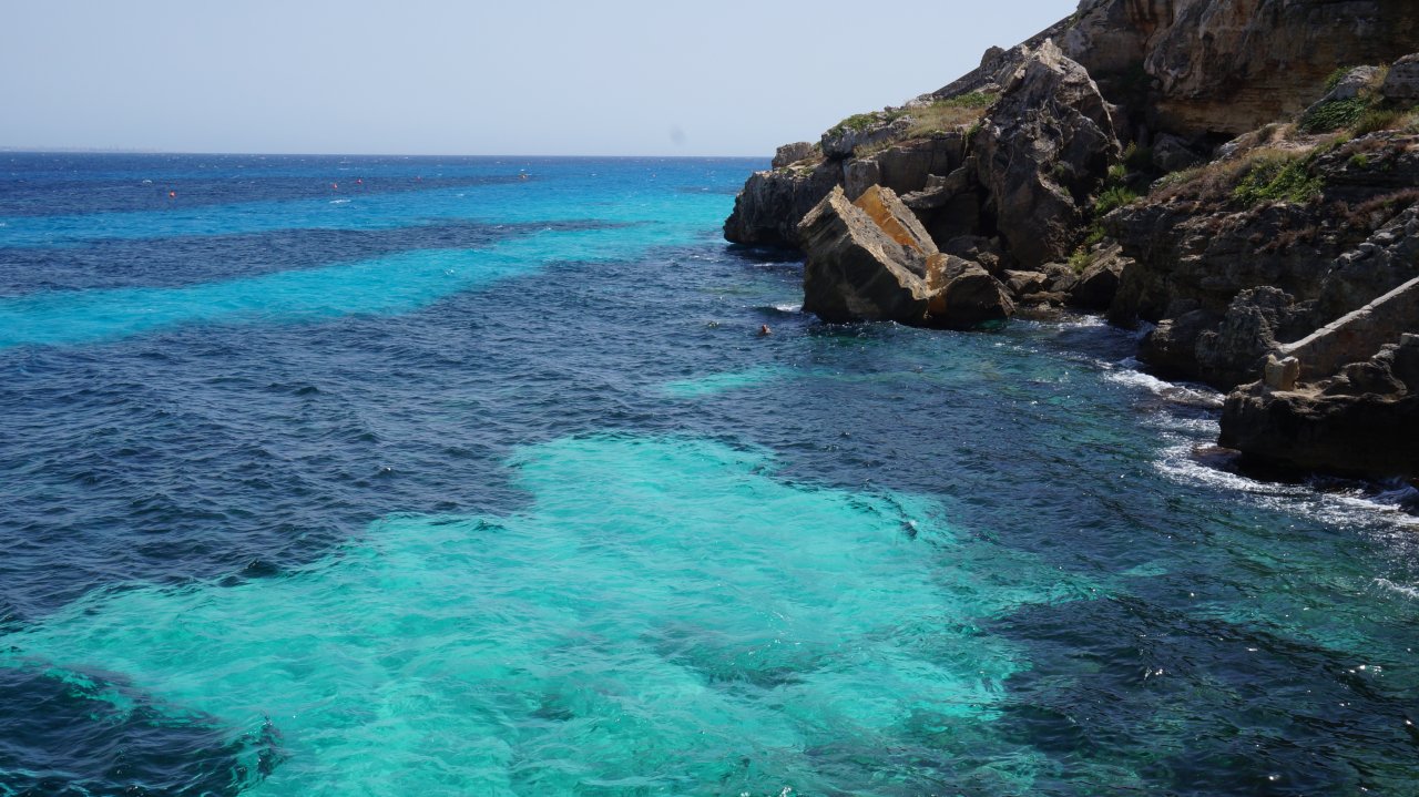 Am vazut una dintre cele mai frumoase ape din cate am intalnit in viata mea, de un albastru atat de puternic incat…atat de puternic. Ziua era insa una vantoasa asa ca erau ceva valuri iar Cala Rossa este ca orice alta plaja spectaculoasa din Sicilia, nu are nisip. Sunt stanci pe care oamenii incearca sa-si gaseasca un locusor si apa. Daca-ti convine, bine, daca nu, iarasi bine. N-o sa se oboseasca splendoare de mare sa-ti intre tie in gratii. Am mai stat cu ochii pierduti in apa, dar timpul nu era de partea noastra, asa ca am plecat spre Bue Marino, fara sa facem baie in Cala Rossa. O carare mica, frecventata de soparle te duce aici, iar cand ajungi apa aia albastra se prezinta din nou indecenta in fata ta, asa goala si limpede de vezi totul in ea. De parca te-ai uita prin dantela fina la ceva inspititor. Aici insa sunt niste grote sapate in stanca iar oamenii stau la umbra ceva mai bine decat la Cala Rossa. Intrarea in apa se face direct. Te arunci de pe stanca. Nu vrei sa te arunci de la stanca? Pai atunci pleaca la Cala Azzura ca acolo este plaja cu nisip alb in apa si fara nisip afara. Am fost si acolo, am facut o baie, dar inainte de a pleca spre Levanzo ne-am intors la Bue Marino si ne-am aruncat de pe stanci in apa transparenta si nelinistita. Locul asta a fost un calmant pentru mine. Unul dintre cele mai bune testate personal pana acum.