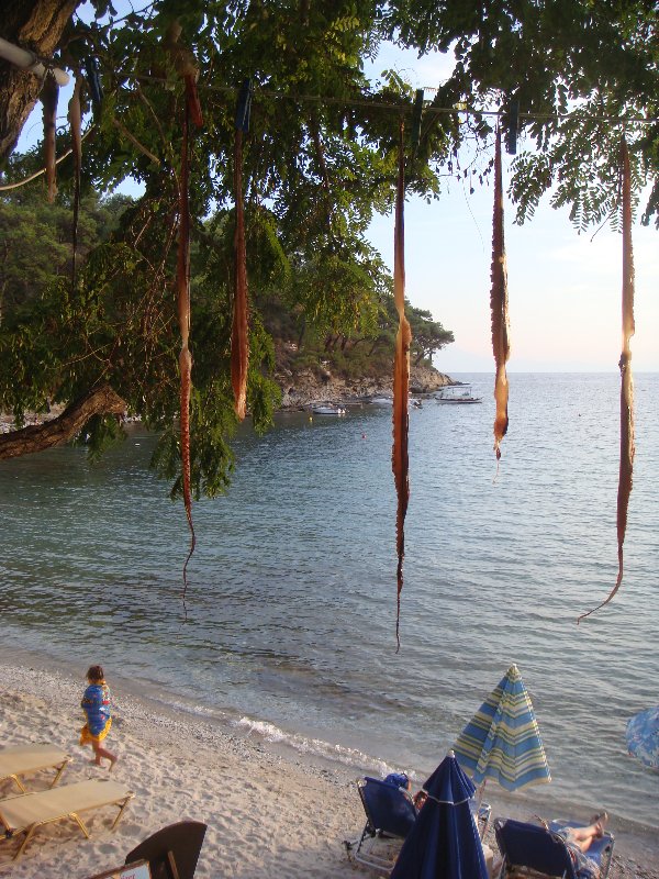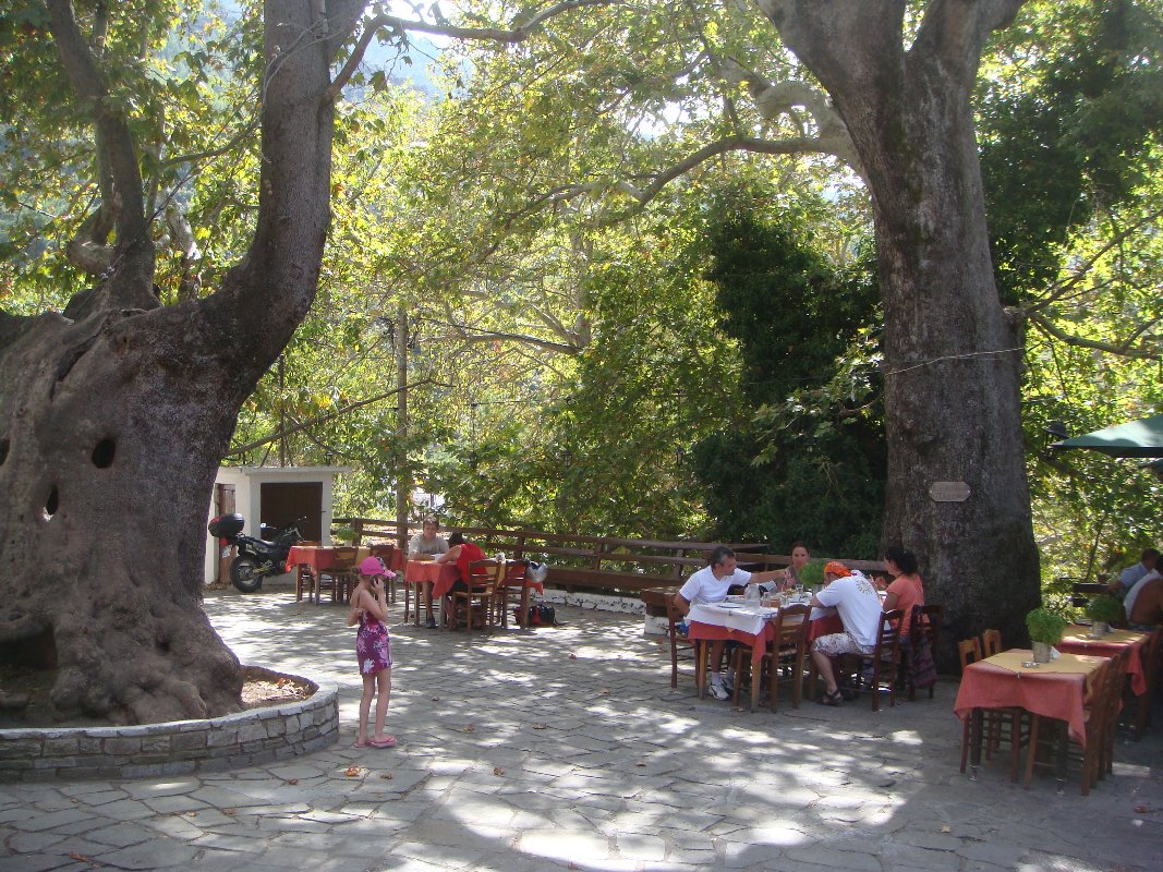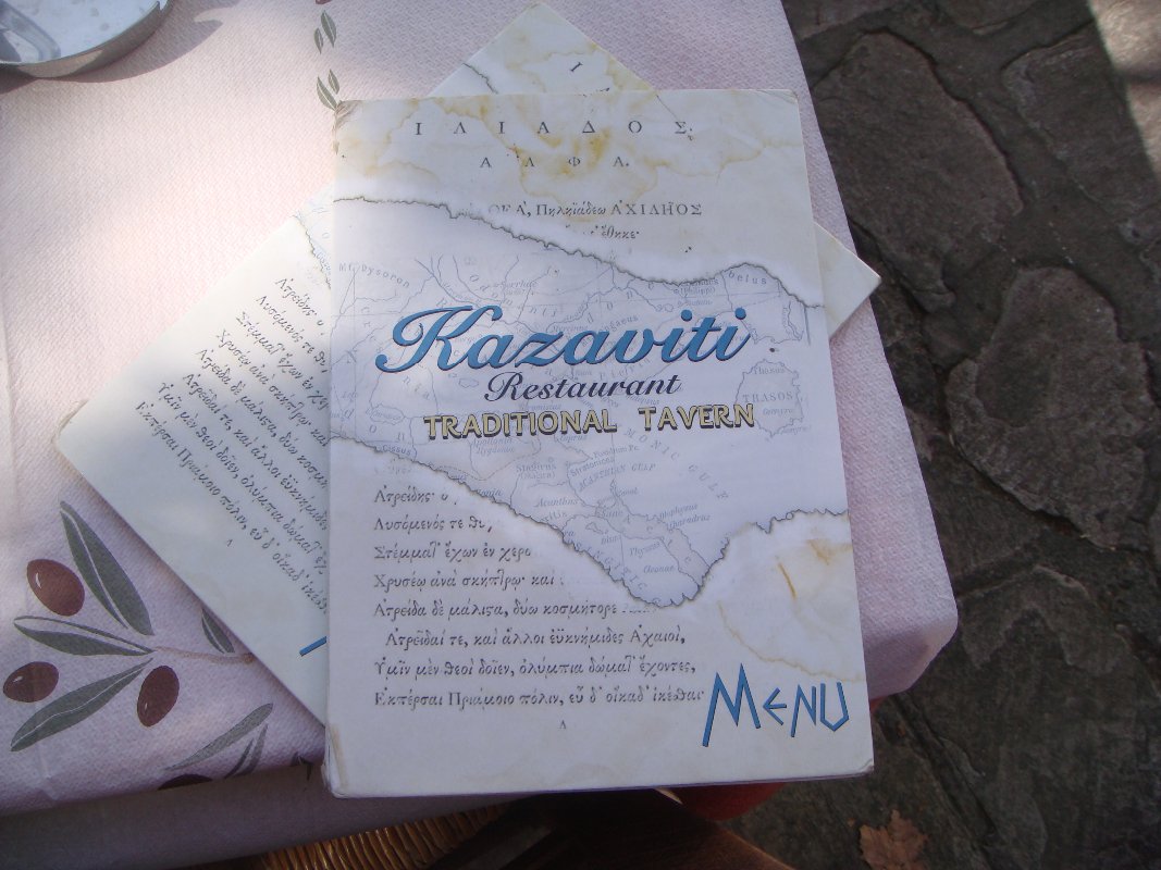 Al doilea loc unde trebuie sa ajungeti este mai in inima insulei si se numeste Kazaviti, o taverna care sta in satul cu acelasi nume. Este o taverna ocrotita de copaci inalti si racorosi unde sa mananca bine de tot.  Mergeti multi si incercati de toate, de la salata gustoasa cu branza feta, vinete coapte in Dumnezeu stie ce sosuri, carnite de peste si de caprite, deserturi care se intrec in calorii si altele pentru ca daca Grecia are ceva in afara de apa ca cerul este mancarea divina. Respirati un pic si luati-o la plimbare prin satul care pare rupt din niste carti vechi. Strazi mici si brupte, oameni putini, liniste multa, case frumoase si soare, mult, mult soare sanatos care face pielea aramie si aduce roseata in obraji. Apoi mergeti la scaldat.